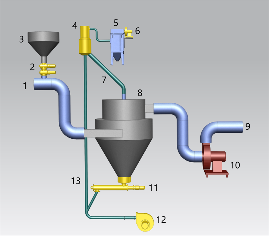 含塵濾料的氣力輸送是由高壓輸送風送入噴射器的入氣口,使含塵濾料被噴射器喉管處的負壓吸入,并提升送入到分離器中,氣固兩相流經分離器后分離出濾料和含塵廢氣。
